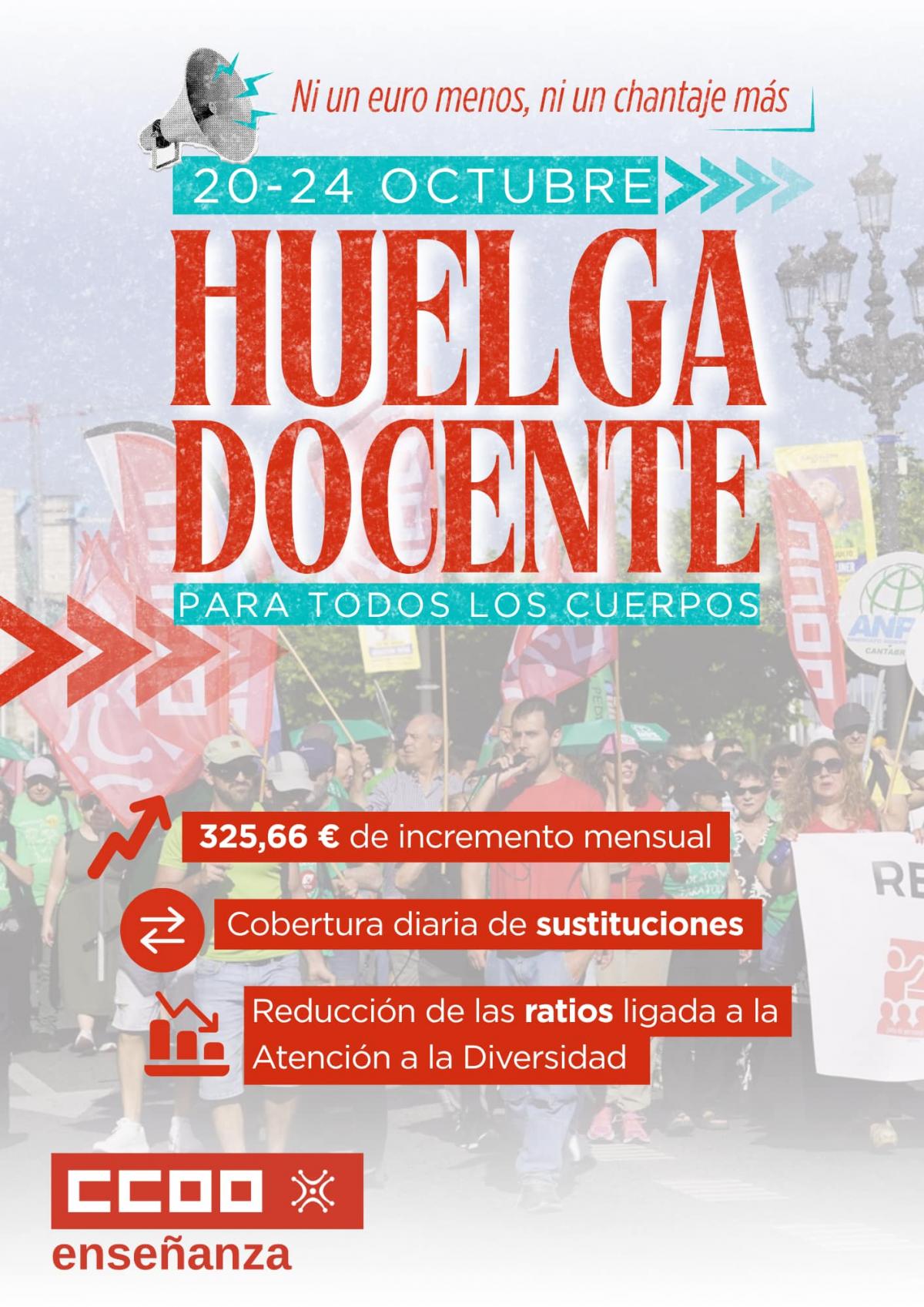 La Federación de Enseñanza de Comisiones Obreras en Cantabria (CCOO) ha llamado hoy a todo el personal docente a secundar de forma masiva la huelga convocada para la próxima semana (del 20 al 24 de octubre) todos los días y en todas las etapas para forzar así una solución al conflicto.